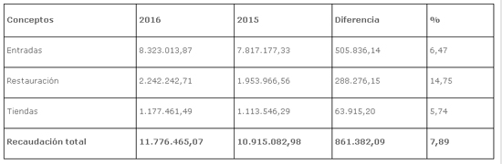 Habiendo recibido 9.623 visitantes más para un total de 210.944 -un incremento del 4,78% frente al mismo mes de 2015-, la EPEL-CACT explica en nota de prensa que la entidad pública registró un aumento del 5,50% en la recaudación por entradas vendidas, o lo que es lo mismo, de 67.708,24 euros.