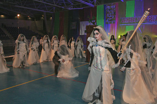 Las Gruñonas, por su parte, tomaron el relevo y saltaron al escenario coreando el himno de la agrupación. Su puesta en escena trasladó a los presentes a un del film del cineasta Tim Burton: La Novia Cadáver, además fantasía escogida para sus atuendos. Con un aspecto más fúnebre, pero sin perder la chispa que caracteriza a las murgas canarias, Las Gruñonas se movieron como pez en el agua por todo el pabellón deportivo haciendo gala de su buen hacer.