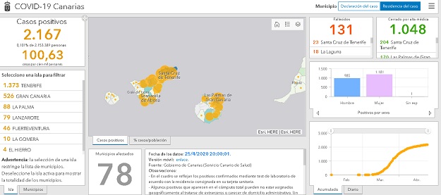 Según ha confirmado la Consejería de Sanidad en su balance de la tarde y tras la actualización que hace de los números a última hora del día, las Islas tienen en estos momentos 2.167 casos de personas contagiadas y 131 muertos por la acción directa de la enfermedad. Una jornada más es importante destacar el número de altas que se han producido en los últimos días, dejando el total acumulado con los que se han conocido este este sábado en 1.048 personas, 12 más que el día anterior.