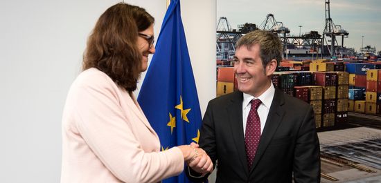 Fernando Clavijo, presidente del Gobierno de Canarias, acompañado por los consejeros de Agricultura, Ganadería, Pesca y Aguas, Narvay Quintero, y Economía, Industria, Comercio y Conocimiento, Pedro Ortega, se reunieron este jueves con la comisaria de Comercio de la Unión Europea, Cecilia Malmström, para transmitirle asuntos de gran importancia para las Regiones Ultraperiféricas (RUP), en especial los problemas que se derivan de la liberalización comercial europea y las oportunidades que ofrece Canarias para el comercio de Europa con África. En este sentido, Canarias ha vuelto a solicitar, como viene haciendo desde 2009, que se encargue un estudio sobre el impacto en las RUP de las negociaciones comerciales de la UE y que se compense a estas regiones por sus eventuales consecuencias sobre las mismas.