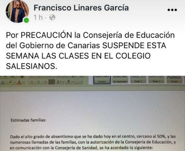 La Consejería de Educación del Gobierno de Canarias ha decidido finalmente y después de pensárselo mucho suspender las clases en el colegio salesiano San Isidro, en La Orotava, por el problema mundial que está suponiendo el coronavirus y que ha provocado por ejemplo que en una Comunidad entera como es la de Madrid no haya clases en este martes o en provincias como Vitoria que se hayan tomado medidas de este tipo. El anunció se produjo sobre las 20:00 horas de este lunes. En él, el departamento del Ejecutivo que preside el socialista Ángel Víctor Torres confirmaba la suspensión de la actividad escolar durante toda esta semana en ese centro tras confirmar este domingo que uno de sus profesores había dado positivo por coronavirus. Aunque el centro educativo funcionó con relativa normalidad después de que saltara el positivo del profesor, con el respaldo de las consejerías de Sanidad y Educación del Gobierno de Canarias, la dirección del centro optó a última hora por suspender las clases debido al elevado absentismo, cercano al 50%, y para tranquilizar a las familias.