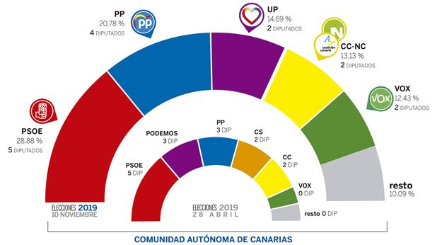 Los resultados en Canarias dejan un panorama diferente al que se vivió en abril, siguiendo eso sí la tendencia que se ha vivido en el ámbito nacional. Así, tras el escrutinio total el análisis deja al Partido Socialista (PSOE) al frente de la tabla una vez más con cinco diputados, dos por la provincia de Santa Cruz y tres por la provincia de Las Palmas, donde vuelve a entrar como diputada la lanzaroteña Ariagona González. La segunda fuerza es ahora el Partido Popular (PP), que recupera parte del terreno perdido en los últimos años y logra cuatro diputados, dos por cada provincia. El siguiente dato destacado es que Coalición Canaria (CC) pierde un diputado por la provincia occidental pero lo gana por la oriental, colocando a la apuesta de Nueva Canarias (NC), Pedro Quevedo, otra vez en la Cámara Baja. Mientras, Ciudadanos es la gran derrotada, al perder a sus dos diputados, Melisa Rodríguez y Saúl Ramírez, y VOX la gran triunfadora, al lograr dos diputados que no tenía, uno por cada provincia. La formación que también mantiene el tipo, a pesar de perder uno de los tres diputados que tenía, es Unidas Podemos.