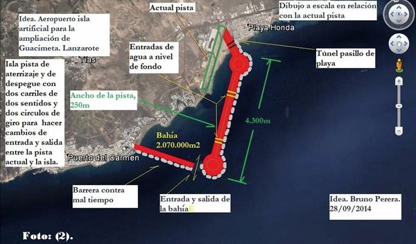 Sin la necesidad de ocupar el único territorio libre que nos queda, repito: -cual debemos guardar para futuras generaciones-, sin derribar montañas, casa alguna, ni modificar carreteras o calles de Playa Honda. –Mi idea está basada en hacer una pista de aterrizaje sobre una isla artificial paralela a la actual alejada unos 700m rumbo Este, y de unas dimensiones de 4.300m de largo por 250m de ancho, con dos carriles en dos sentidos, y dos círculos de giro, uno en cada extremo, para que los aviones puedan aterrizar y despegar desde el Norte y desde el Sur, según los tiempos climáticos lo exijan. Y también estaría adecuada para entrar y descargar, y aprovisionar en la pista actual y despegar de la misma, o a través de la isla artificial; igualmente según los tiempos climáticos lo exijan.