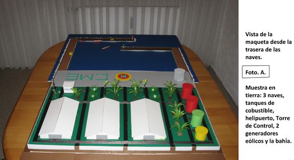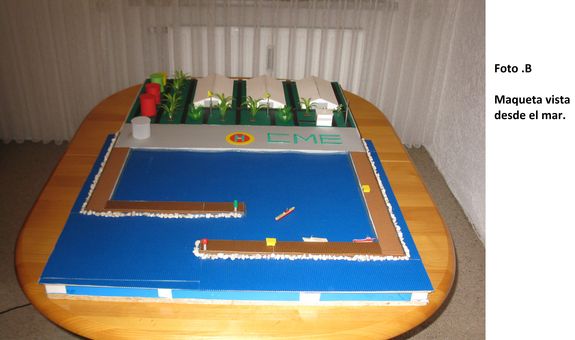 10. En ese lugar con Google Earth tomé un área de tierra y mar de 800m de largo X 500m de ancho, y dibujé sobre ella lo que podría ser Control Marino Ecológico. (Añado las fotos de Google Earth de la posible ubicación de CME, un plano, y una maqueta hecha a una escala muy próxima con la realidad para que usted pueda observar los detalles.