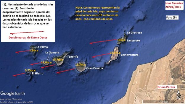 En otra forma podemos decir: (Lanzarote nació 181 años después del Jurásico). (Fuerteventura 183,4). (Gran canaria, 186,3). (Tenerife, 184,3). (La Gomera, 188) (La Palma, 198,4). Y ( El Hierro 199,25). Nota. Si no está usted de acuerdo con estos datos, le sugiero que entre en Internet y ponga: Edades de las Islas Canarias. Encontrará un abanico de edades que lo hará pensar cuáles de ellas tomar como verdaderas.