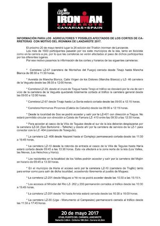 En dicho Plan, se detallan las carreteras de la isla que sufrirán cortes y restricciones de tráfico durante el transcurso de la prueba. En este sentido, a través del enlace http://rutas.lanzarotedeportes.com/, de la página web del Servicio Insular de Deportes, pueden consultarse los horarios de los cortes de vías programados, los tramos que serán cerrados en uno o en los dos sentidos, así como las rutas alternativas.