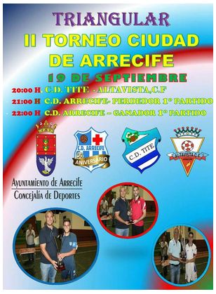 A las 20:00 horas se enfrentan CD Tite y Altavista CF. El perdedor de este primer encuentro se mide a partir de las 21:00 horas al CD Arrecife. Y el torneo concluirá con el enfretamiento entre el CD Arrecife y el ganador del primer encuentro, partido que se disputará a partir de las 22:00 horas.