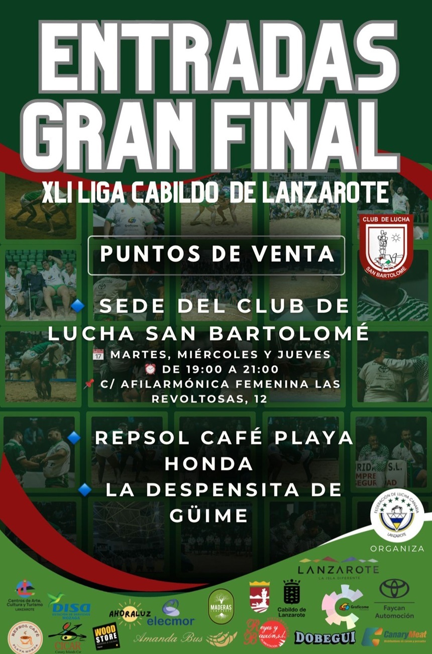 Este martes comienza la venta de entradas de la final de la liga Cabildo Insular de Lanzarote en la sede social del club de lucha San Bartolomé Graficame Faycan Automoción de 19 a 21 horas este martes, miércoles y jueves. También se venderán en la Café Repsol de Playa honda y dentista de Güime. En el municipio de Tinajo las entradas estarán a la venta en el restaurante Casa Ignacio y también se pueden conseguir a través de los directivos de este club.