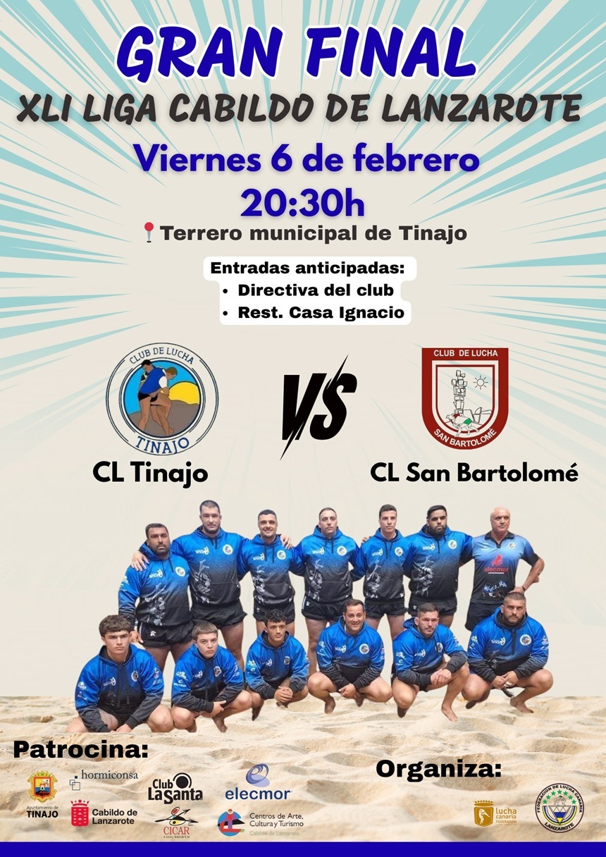 Este viernes seis de febrero todos los caminos de la lucha canaria en Lanzarote se dirigen al terrero municipal de Tinajo donde se disputará la gran final del XLI Liga Cabildo Insular de Lanzarote de categoría senior. Tras la gran acogida en las cuatro luchadas de semifinales todo parece indicar que habrá un lleno absoluto para la gran final.