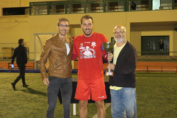 El presidente de la Delegación Insular de Fútbol de Lanzarote, José Antonio Valido, fue el encargado de entregar el trofeo de campeón al capitán del Altavista CF, Toñito.