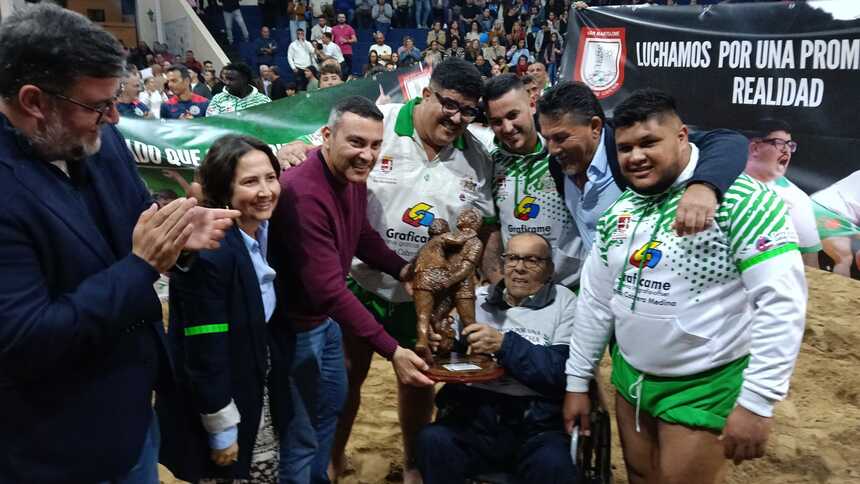 La primera luchada fue para el joven destacado del Tinajo quien parecía estar imparable aunque tuvo que hacer un descanso de 5 minutos al tener dificultades. Pese a no empezar de la mejor manera la última agarrada, Rayco García hizo una demostración de resilencia y en las dos siguientes tumbo a Catarino dándole el ansiado título al equipo de San Bartolomé.