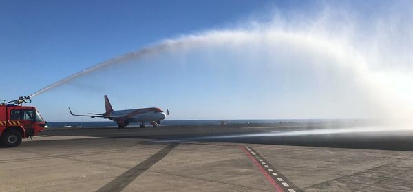 El avión, un Airbus A320, aterrizó este martes alrededor de las 16:30 horas y fue recibido por los bomberos del aeropuerto con el tradicional arco de agua. A la llegada del vuelo, el consejero de Promoción Turística del Cabildo de Lanzarote, Ángel Vázquez; el director insular de la Administración del Estado en Lanzarote, Juan Ramón Pérez; el director del Aeropuerto, Juan Carlos Peg; el consejero delegado de la Sociedad de Promoción Exterior de Lanzarote (SPEL-Turismo Lanzarote), Héctor Fernández, y Rosa Medina, en representación de la compañía dieron la bienvenida a los pasajeros y a la tripulación con una tarta conmemorativa. Además, se recibió a los viajeros con música popular a cargo de la parranda Pal Porrón.