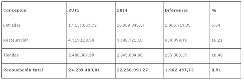 Durante el año recién finalizado, además, el servicio de restauración, “donde antes éramos más débiles” registró un “espectacular” aumento de la recaudación que ascendió a 630.399,39 euros con respecto a 2014, esto es, un 16,21%. De otro lado, se ingresaron 235.303,09 euros más en las tiendas, lo que supone un incremento del 10,48%.