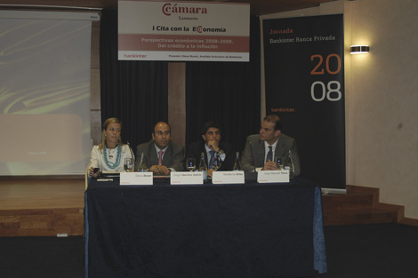 Elena Bonet, analista Financiero de Bankinter, fue la encargada de realizar la ponencia principal, titulada: "Perspectivas 2008/2009. Del crédito a la inflación", en la que se analizaron las perspectivas para los mercados y la economía en el corto y medio plazo: macroeconomía, evolución de los tipos y de las bolsas, junto a las posibilidades de inversión más interesantes a criterio de los expertos del Banco.