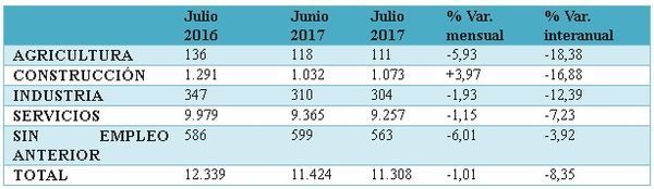 Por su parte, el sector industrial también apunta una disminución del paro de 6 personas (-1,93%), mientras que el desempleo en la construcción crece en 41 personas (3,97%) en comparación con el mes anterior. En términos interanuales, es igualmente el sector servicios el que anota la caída más intensa en lo que respecta al número de parados, unos 722 desempleados menos (-7,23%). Porcentualmente, es la agricultura (-18,38%), seguido de la construcción (-16,88%) y la industria (-12,39%) las que más recortan las cifras de desempleados.