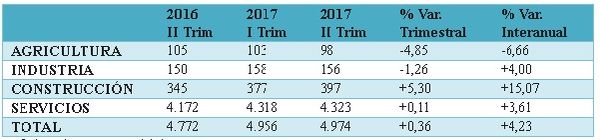 Si comparamos el segundo trimestre de este año con el mismo periodo de 2016, constatamos un aumento de 202 empresas, dato que valora positivamente la CEL. Por sectores se observa que las empresas de la construcción crecieron más de un 15%, seguido de las industriales (4%) y del sector servicios (3,61%). El único sector en el que disminuyó el número de empresas fue el de la agricultura (-6,66%).