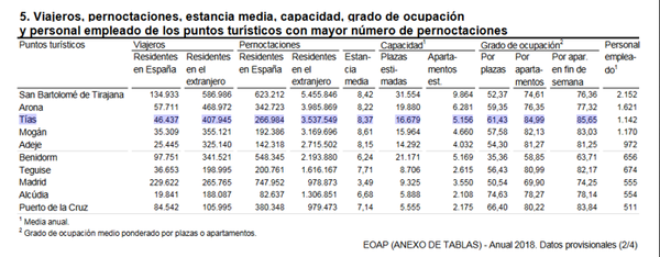 Según el INE, la costa de Tías registró de media, en todo el 2018, una ocupación del 84,99 por volumen de plazas alojativas en el sector de apartamentos mientras que este ratio sube al 85,65 % por alojamiento en fines de semana. Tras Tías es el municipio de Mogán, en la isla de Gran Canaria, el que figura en segunda posición en este ranking, y Adeje, en Tenerife, en el tercer puesto de este ranking de zonas turísticas con mejores porcentajes de ocupación en apartamentos.