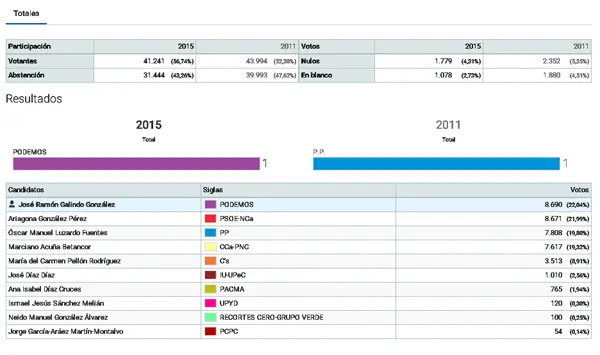 La candidatura de Carlos Meca con PODEMOS ha superado incluso a formaciones tradicionales como el Partido Popular (PP) y al Partido de Independientes de Lanzarote (PIL) en número de votos. De hecho, el PP queda como cuarta fuerza política en el Cabildo lanzaroteño, con 5.031 votos, el 12,37%, pasando de los 6 consejeros obtenidos en 2011 a los 3 actuales.