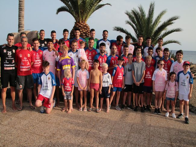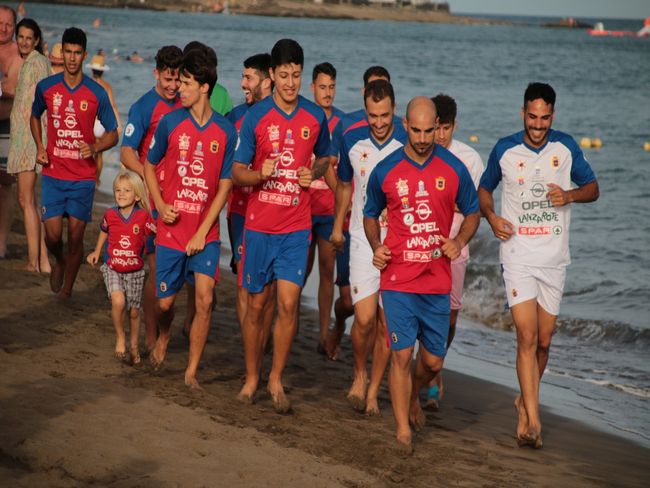 Antes del comienzo del entrenamiento hubo una sesión de fotos. Unas imágenes que quedarán para el recuerdo en una de las localidades turísticas más emblemáticas de la isla de Lanzarote. Tras las fotografías, los seguidores más jóvenes pudieron compartir la primera parte del entrenamiento con los jugadores rojillos, corriendo por la orilla de la playa junto a los futbolistas. Un entrenamiento más distendido de lo habitual, donde no faltaron diferentes juegos sobre la arena.