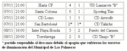 El San Bartolomé, que iba ganando el partido por la mínima ante un Tahíche que estaba dando la cara, no pudo concluir este fin de semana llevándose la victoria, ya que el partido fue suspendido en el descanso debido a que en el Municipal de Las Palmeras se produjo un apagón de las torretas de iluminación. Este es el segundo partido que le es aplazado al CD Tahíche en lo que va de liga.