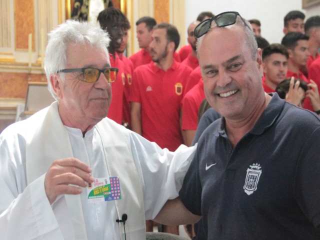 Tras las palabras del párroco, Rosmen, Ayoze Pérez y Miguel Gómez, capitanes del primer equipo, depositaron a los pies de la Virgen de Los Dolores un ramo de flores donado por la Floristería Las Cristinas, de Argana, recibiendo posteriormente el sacerdote un abono para que pudiera disfrutar de la temporada en la Ciudad Deportiva.