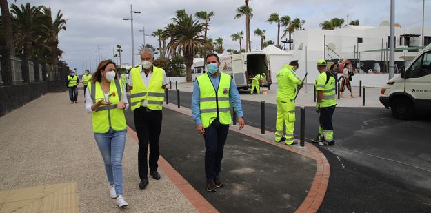 La presidenta del Cabildo, María Dolores Corujo, y el consejero de Obras Públicas, Jacobo Medina, han supervisado este lunes por la mañana junto al alcalde de Tías, José Juan Cruz Saavedra, y el concejal de Turismo, Mame Fernández, las obras de remodelación que se llevan a cabo en la Avenida de Las Playas en Puerto del Carmen, concretamente en el tramo comprendido entre la Avenida Italia y la calle Noruega.