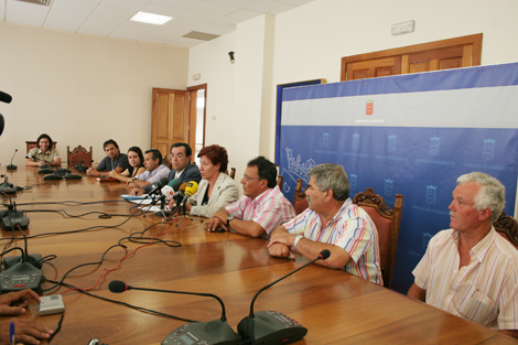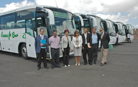Posteriormente, a las 13:00 horas, también en el antiguo salón de Plenos, Inés Rojas firmó con la empresa Arrecife Bus el Contrato Programa Insular de Transporte, por el que la Primera Corporación de la Isla se compromete, entre otros aspectos, a incrementar y mejorar las líneas de transporte de viajeros, adquiriendo ocho nuevos vehículos que vendrán a reforzar la flota actual del transporte interinsular, y que fueron presentados, acto seguido, en el Recinto Ferial de Arrecife.