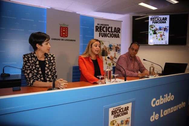 La presidenta del Cabildo, María Dolores Corujo, el consejero de Presidencia, Residuos y Actividades Clasificadas, Andres Stinga y la respresentante de Ecoembes en Canarias, Carlota Cruz, han presentado este martes la campaña “En Lanzarote, Reciclar Funciona”.