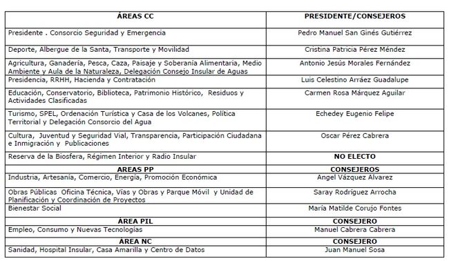 El presidente del Cabildo de Lanzarote, Pedro San Ginés, dio a conocer durante la mañana de este jueves, 28 de diciembre, la distribución de áreas de la Institución en el transcurso de una comparecencia pública que tuvo lugar en el Salón de Plenos de la Primera Corporación insular, en la que estuvieron presentes Saray Rodríguez, nueva vicepresidenta primera y consejera del Partido Popular; y Juan Manuel Sosa, responsable de Sanidad y consejero de Nueva Canarias.