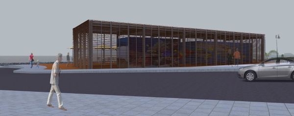 El cerramiento de lamas de madera de la fachada permite la apertura total del mismo mediante módulos de 1,66 metros de ancho que se pliegan en su parte superior para generar un parasol en la terraza y zona de cafetería. El tratamiento de esta terraza se realizará mediante madera IPE dando así continuidad al interior y exterior del mismo.