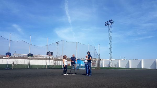 El alcalde de Tías, Pancho Hernández, acompañado por el teniente de alcalde, Amado Jesús, la concejal de Urbanismo, Saray Rodríguez Arrocha, y el concejal de Deportes, Francisco Javier Aparicio Betancort, visitaron este martes estas instalaciones del Campo de Fútbol de Puerto del Carmen donde la empresa adjudicataria ultima el montaje e instalación de las nuevas torretas de iluminación.