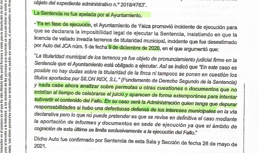 En este sentido, el portavoz municipal recalca que "el TSJC refleja la inacción del alcalde al no presentar la documentación de permuta en el juicio donde se dictaminó la titularidad privada de la parcela y el derecho de la propiedad a su cerramiento, así como por no presentar recurso a esta sentencia”. “Esta falta de interés por defender los intereses de los vecinos y vecinas del municipio provocó que dicha sentencia, que desestimaba la titularidad municipal de la parcela, entrase en fase de ejecución lo que invalidó el intento posterior del alcalde de corregir su inacción remitiendo fuera de plazo la documentación de permuta, tal como recoge el TSJC y de lo que no informó en la reunión”, añade.