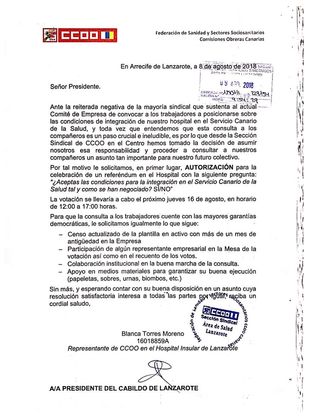 Además, el representante de CCOO ha insistido en que desde el sindicato no dan da validez a la última Asamblea del Comité de Empresa y ha defendido que convenio con el Servicio Canario de Salud como beneficioso para los trabajadores. Y es que, según el sindicato CC OO, "no corren ningún tipo de peligro los interinos ni el personal sustituto. Van a seguir siendo laborales, en el caso de que la integración salga adelante en la votación del próximo 16 de agosto, que es por lo que nosotros apostamos, y creo que el resto de formaciones sindicales también"., ha dicho. "Si no lo tienen claro, tienen que decidirlo rápidamente, porque la integración es inevitable", ha añadido. Cabrera.
