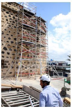 Eugenio, explica en un comunicado de prensa el Cabildo, se desplazó el pasado viernes al MIAC-Castillo de San José para acompañar a los técnicos del estudio especializado Tracer en la visita que realizaron para comprobar el grado de ejecución de las obras de rehabilitación que se están acometiendo en las fachadas de la fortaleza. Una intervención que obedece al deterioro que presentan los sucesivos morteros que se han ido aplicando en los muros de la fortaleza a lo largo de la historia que han estado expuestos, constantemente, a la acción erosiva del viento y a un ambiente de alto contenido salino.
