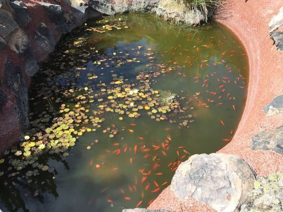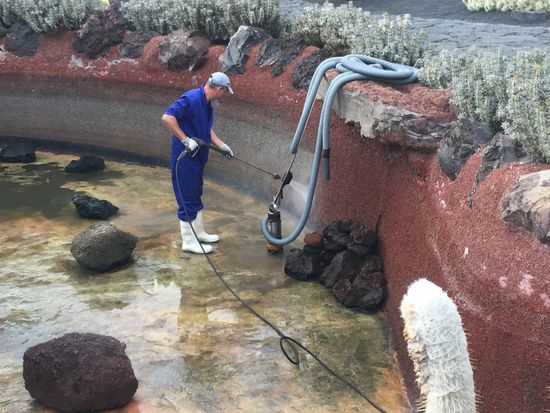 Técnicos y operarios de los Centros de Arte, Cultura y Turismo del Cabildo de Lanzarote están procediendo estos días a la limpieza y el acondicionamiento del estanque del Jardín de Cactus. Los trabajos persiguen el adecentamiento global de la laguna, hogar de un banco de carpas koi y de otro de guppys, y de su entorno, expuesto de forma permanente a la acción de los agentes meteorológicos y de la colonia de pequeñas aves y de los miles de insectos que tienen allí su hábitat.