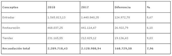 De igual forma, hay que destacar el incremento del 6,10% registrado en los ingresos de los servicios de restauración, esto es 26.922,79 euros, y que las tiendas facturaron un 9,03% más con respecto a enero de 2017, o lo que es lo mismo, 19.136,63 euros más.