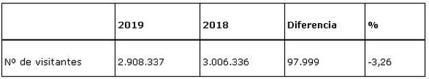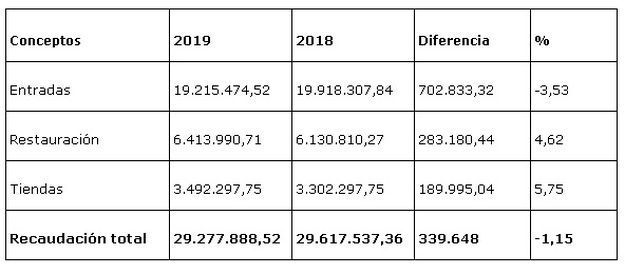 Las tiendas de los Centros facturaron durante el pasado año por valor de 3.492. 297,75 euros, un 5,75% más con respecto a 2018, mientras que los ingresos del servicio de restauración crecieron un 4,62% hasta alcanzar 6.413.990,71 euros. Por contra, los Centros recibieron 2.908.337 visitantes durante el pasado año, un 3,26% menos que en el ejercicio anterior. Obviamente, los ingresos por la venta de entradas siguieron la misma tendencia y cayeron un 3,53%, hasta alcanzar los 19.215.474,52 euros.