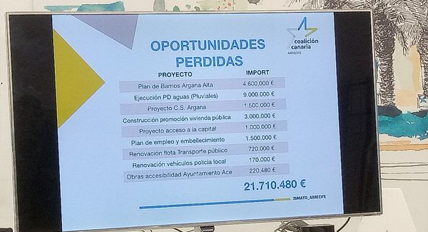 Coalición Canaria (CC) Lanzarote ha denunciado este miércoles en rueda de prensa que el Ayuntamiento de Arrecife ha perdido casi 22 millones de euros, en concreto 21.710.480 euros, en diversas inversiones y proyectos en los 17 últimos meses, desde que los nacionalistas se ausentaran del Gobierno de la capital dando por roto el pacto con el Partido Socialista (PSOE).