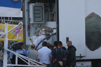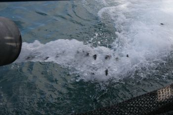 Tras la renovación del agua para que doradas y lubinas se aclimaten a la temperatura y salinidad del nuevo medio atlántico, se pasará a las fases de crianza. En primer lugar está la fase de “siembra” a través de tuberías de 160 milímetros, que culminaría descargando el pescado desde las cubetas de transporte hasta las jaulas.