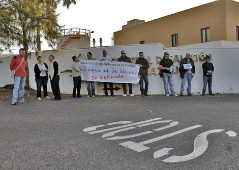 Miembros de la Mesa Social 'En Defensa de lo Público: Ahora el Agua' se han concentrado este viernes a primera hora de la mañana frente a las puertas de la empresa pública de Aguas en Lanzarote, Inalsa, ante el proceso de gestión indirecta que se pretende instaurar desde el Cabildo de Lanzarote.