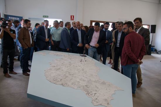 Los presidentes del Gobierno de Canarias y del Cabildo de Lanzarote, Fernando Clavijo y Pedro San Ginés, respectivamente, acompañados por el presidente del Consorcio del Agua, Echedey Eugenio, el consejero de Industria y Energía de la primera Institución insular, Ángel Vázquez y la consejera de la Unidad de Coordinación de Proyectos, Saray Rodríguez, entre otras autoridades, han procedido durante la mañana de este martes a la inauguración oficial del Parque Eólico Teguise I.