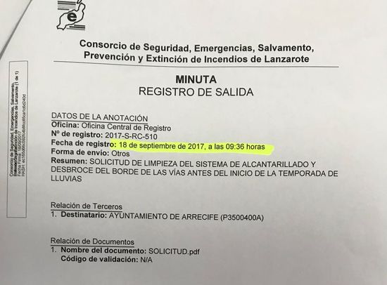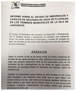 Está recogido en un informe que realizó el Consorcio de Seguridad, Emergencias, Salvamento, Prevención y Extinción de Incendios de Lanzarote y que se presentó públicamente junto con representantes del Cabildo, ayuntamientos, Consorcio de Seguridad y Emergencias, Consorcio del Agua, Consejo Insular de Aguas, Canal Gestión Lanzarote y Cámara de Comercio. En esta sesión que se hace todos los años antes de las lluvias, que se denomina Comisión de Seguimiento de ‘Prevención de Incidentes por Lluvias’, se presentó un estudio que llevaron a cabo los bomberos del Consorcio en la que detallaba el estado de la red de aguas pluviales de todos los municipios, y de forma específica -con un informe- de la de Arrecife.