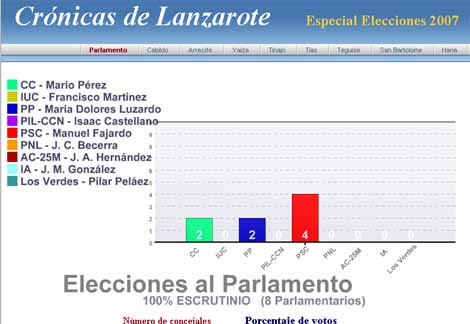 Quienes sí dieron la sorpresa en la noche del domingo fueron los integrantes de PNL y NC, cuya alianza electoral les servirá para contar con dos consejeros en la Máxima Corporación insular, además de los dos concejales de Arrecife y uno en San Bartolomé. También el Partido Vecinal para el Progreso de San Bartolomé (PVPSB) dio la sorpresa al lograr con 329 votos un concejal, Manuel Rodríguez.