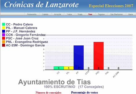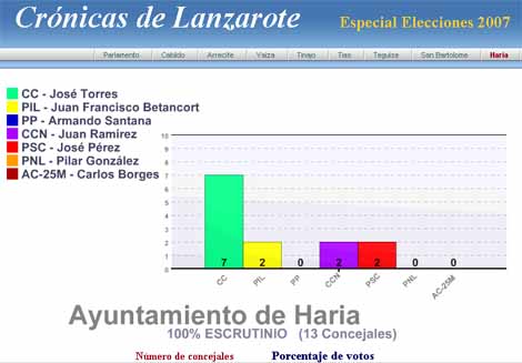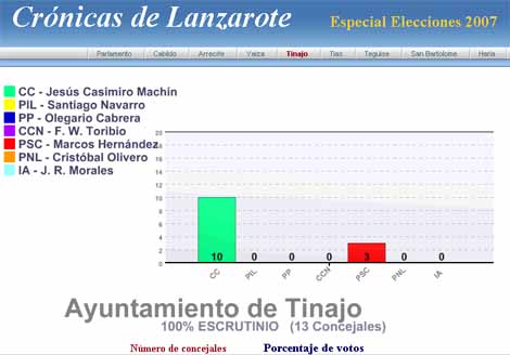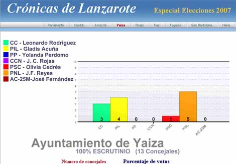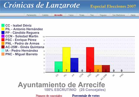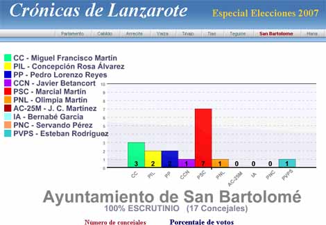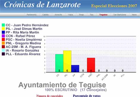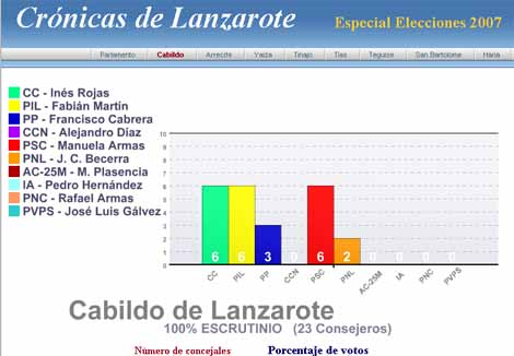 Sin embargo, en Arrecife CC contará sólo con 3 concejales -por los 4 de la pasada legislatura- 5 en Teguise, 3 en San Bartolomé, 3 en Yaiza y 1 en Tías.