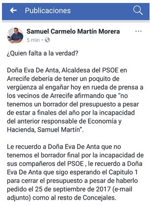 Eva de Anta, que acusa a CC de hacer "estrategia partidista y de convertir en protagonista al Gobierno en lugar de su gestión hacia el ciudadano", ha reprochado a los nacionalistas en la rueda de prensa ofrecida en el Archivo Municipal, que ha contado con presencia de líderes políticos como la secretaria general del PSOE en la Isla, María Dolores Corujo, que la capital aún no cuente con un borrador de los nuevos Presupuestos de 2018.