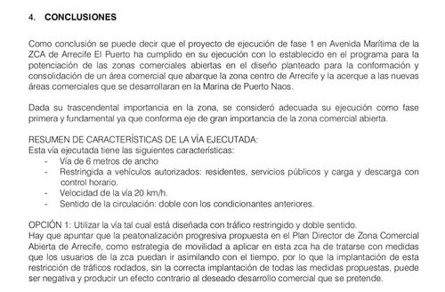 El informe, recalcan desde el Ayuntamiento de Arrecife, "se centra en la consecución del objetivo de potenciación de las zonas comerciales abiertas y no entra en otras valoraciones como la afección al transporte público o la recuperación de espacios para el disfrute ciudadano".