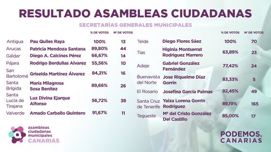 Los 17 municipios que se dotaban en esta primera tanda de órganos municipales ya cuentan con sus Secretarias Generales Municipales, lo que les permitirá marcar la política municipal con una referencia clara en sus municipios desde Podemos. Y los consejos Ciudadanos Municipales en ciudades como Las Palmas de Gran Canaria y San Cristóbal de La Laguna, “eso nos permitirá contar con órganos políticos capaces de llevar a la organización morada con mayor fortaleza a los procesos electorales que afrontamos en 2019”, valoró Sánchez.