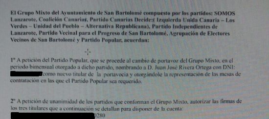 Fuentes municipales explican a este periódico que durante el pleno del pasado lunes, los concejales de Coalición Canaria (CC), Partido de Independientes de Lanzarote (PIL), Somos Lanzarote (SL), Partido Canarias Decide (compuesto por Izquierda Unida Canaria, Los Verdes, Unidad del Pueblo y Alternativa Republicana), el Partido Vecinal para el Progreso de San Bartolomé (PVP) y la Agrupación Vecinal de Electores (AVE) revocaron finalmente su firma de un documento remitido a estos partidos políticos por la Ejecutiva insular del PP en Lanzarote.