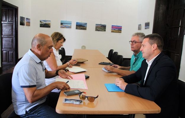 Durante la reunión con el alcalde de Yaiza, Óscar Noda, y el primer teniente alcalde, Ángel Domínguez, se destacó la importancia de finalizar las obras de dos proyectos estratégicos para el municipio, como son la ampliación del puerto de Playa Blanca y la construcción del colegio de Secundaria en el mismo núcleo.