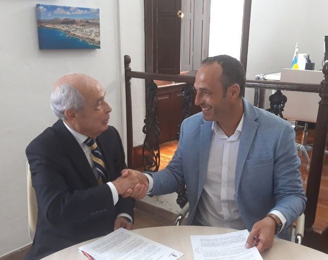 El servicio municipal de limpieza del Ayuntamiento de Haría contará con un nuevo camión recolector y compactador de residuos domésticos, tras la firma del contrato de compra llevada a cabo este martes entre el alcalde, Alfredo Villalba, y el propietario de la empresa Whole and Retailer, José Juan Abou-Medlej.